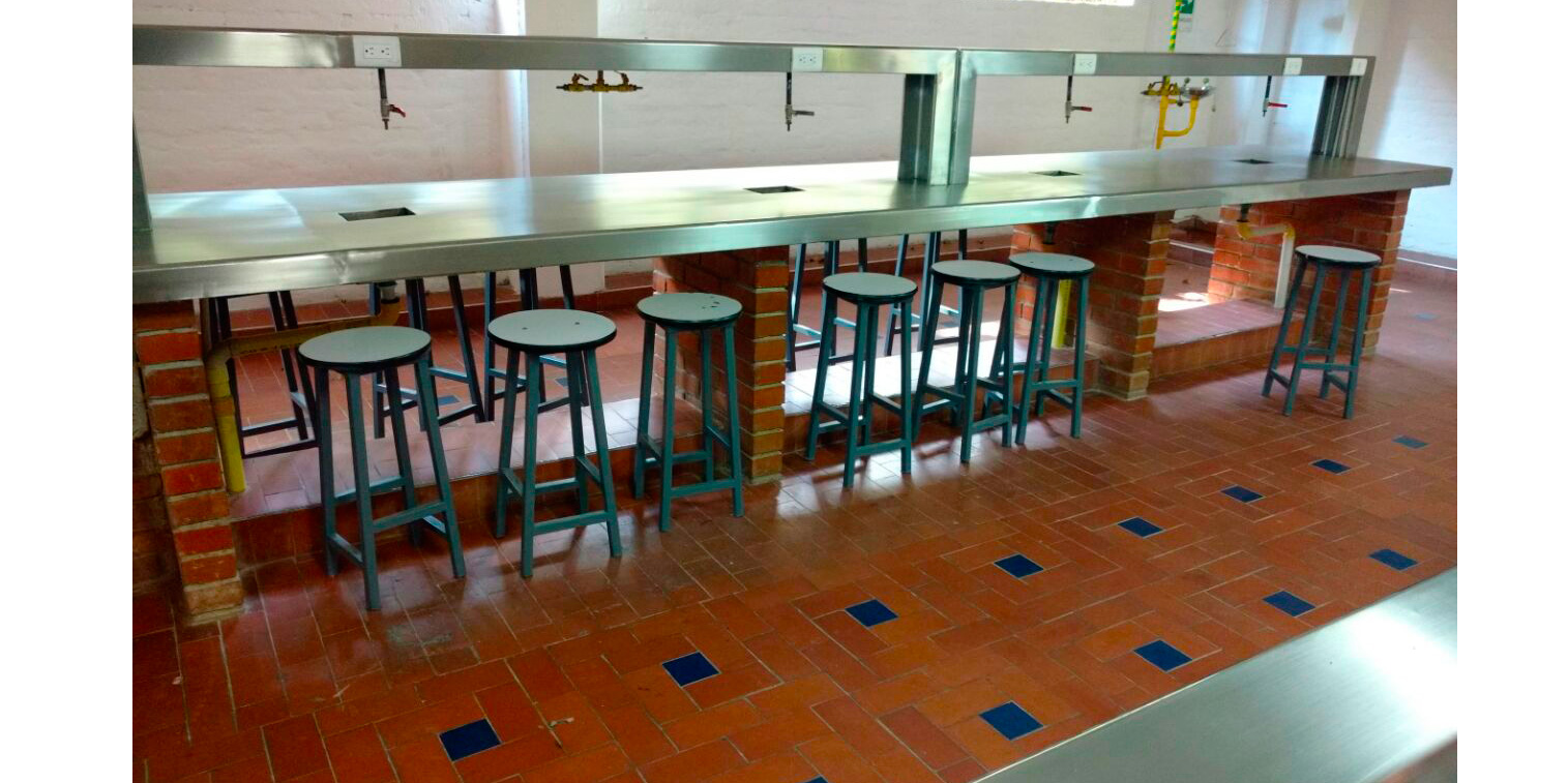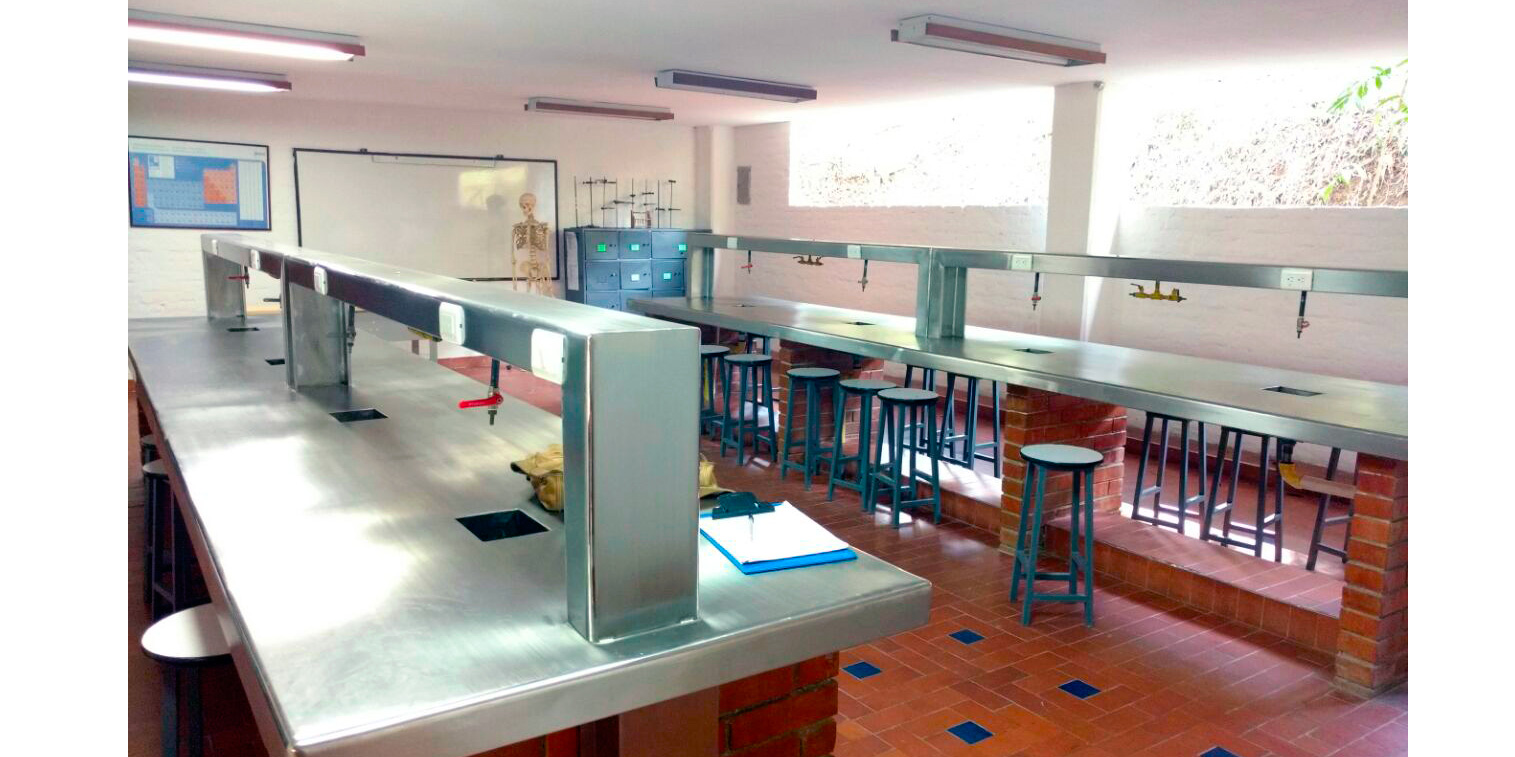 Fabricación, suministro y montaje de mesón de trabajo para laboratorio, fabricado en estructura metálica coll rolled, tubular cuadrado, pintura electroestática color a elegir, con niveladores plásticos de alta resistencia superficie de acero inoxidable 304 calibre 16 medidas 5.00 mts x 1.40 mts. Fabricación, suministros y montaje de puesto de trabajo sencillo con superficie de madercor, costados metálicos coll rolled, pintura electroestática medidas 1.50 mts. x 60 mts.